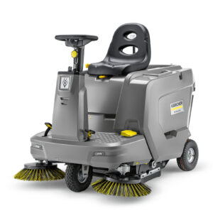 Für staubige Innenbereiche, da emissionsfrei: die Aufsitzkehrmaschine KM 100/120 R Bp Pack mit leistungsstarker 240-Ah-Batterie, separatem Ladegerät und hydraulischer Hochentleerung.