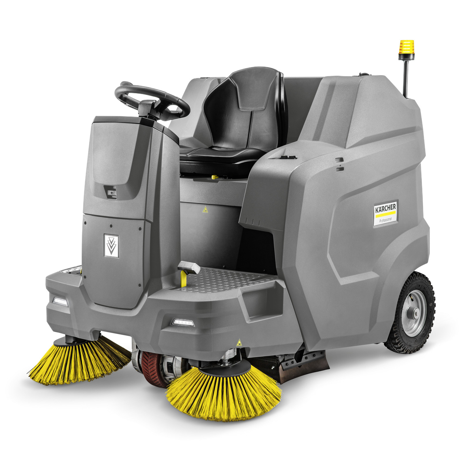 Für staubige Innenbereiche, da emissionsfrei: die Aufsitzkehrmaschine KM 100/120 R Bp Pack mit 240-Ah-Batterie, Einbauladegerät, hydraulischer Hochentleerung und serienmäßig 2 Seitenbesen.