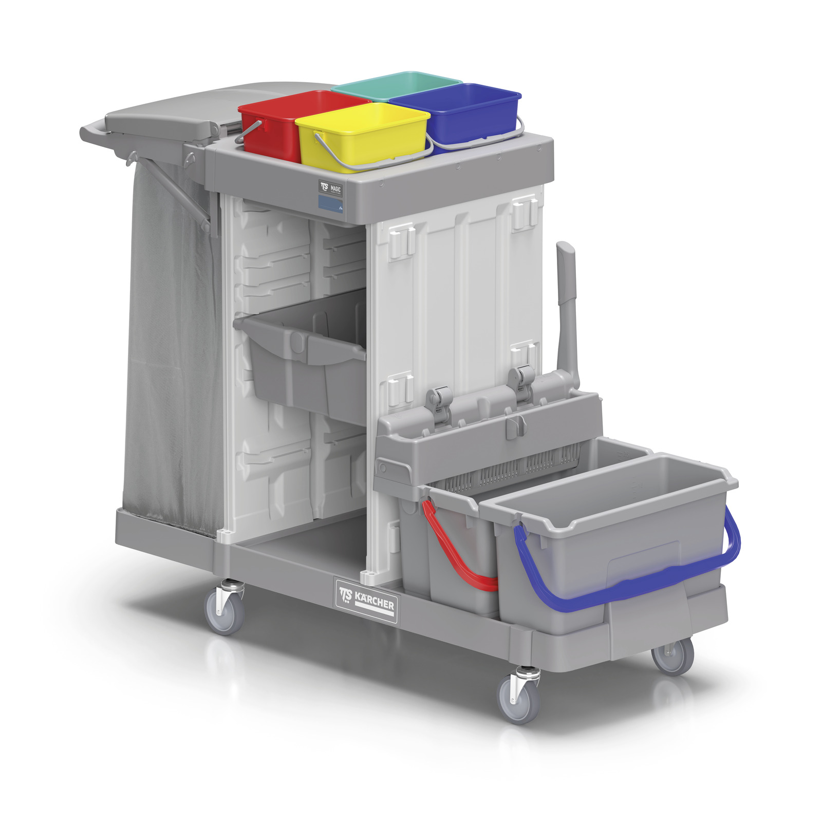 Systemwagen mit 3 Einheiten: 120 L klappbarer Sackhalter, Lagerung mit Schublade und Reinigung durch Presse mit Doppelsystem mit 2 Eimer.