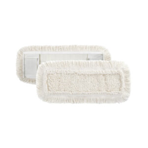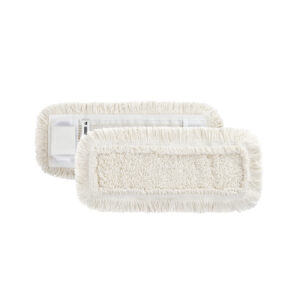 Bezug mit Taschen und Laschen aus weißer Mikrofaser mit blauen Streifen für strukturierte Böden. Die Taschen, Laschen und das Deckblatt sind aus Polyester.