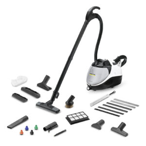 Der Dampfreiniger SC 5 EasyFix Iron Select Bath Edition mit 4,2 Bar Dampfdruck enthält ein Dampfdruck-Bügeleisen, eine VapoHydro-Funktion, eine Bodendüse und weiteres Zubehör.